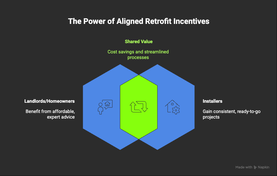 The result is a rare alignment of incentives: landlords and homeowners pay no premium for advice, installers win consistent work without chasing leads, and retrofit costs fall because speculative pricing and duplicated sales effort are stripped out of the system.